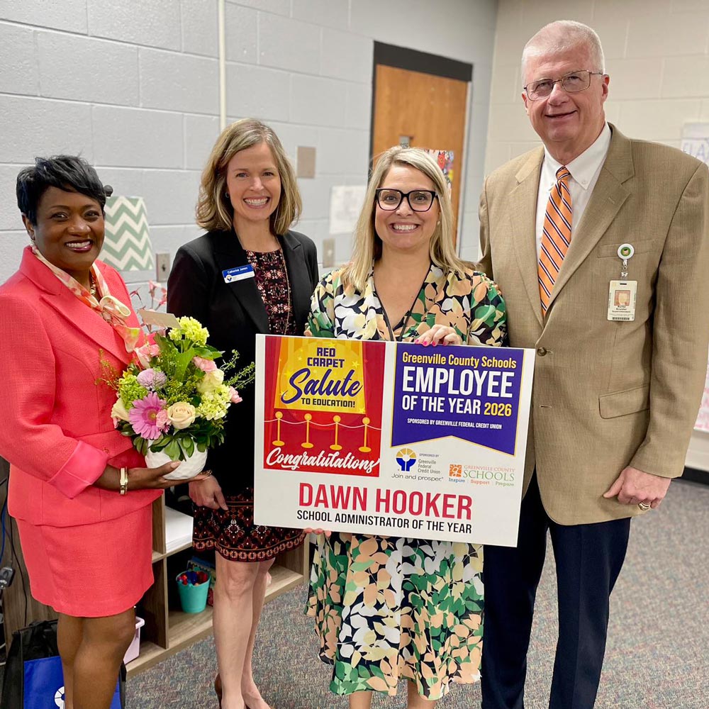 Greenville County Schools announced Employee of the Year Awards in six categories. Greenville Federal Credit Union provided each winner with $500. Each winner’s school or department also received $500 so their peers can share in the honor. The winners will be recognized at the annual Salute to Education banquet.