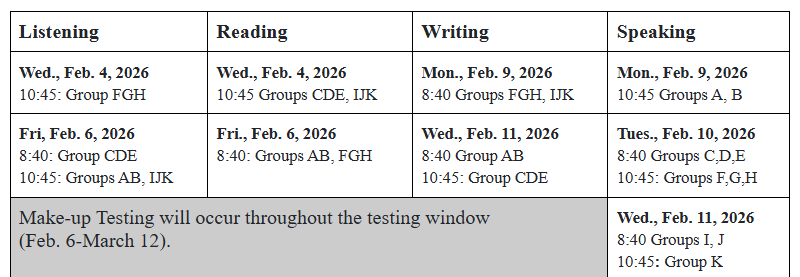 Students will have a letter that includes their group and specific scheduling information about when and where they will be testing as well as how to best prepare. Some students’ schedules may change if it is necessary, such as if a student must test individually for Speaking. This schedule was updated on Feb. 2, 2026 due to inclement weather impacting the schedule with eLearning days. In the case of additional inclement weather delays, the schedule could change.