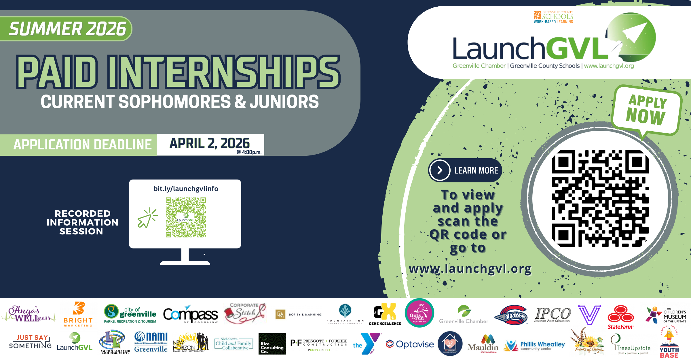 The deadline to apply is April 2, 2026 at 4:00pm. Students should apply directly by going to launchgvl.org and then clicking positions.