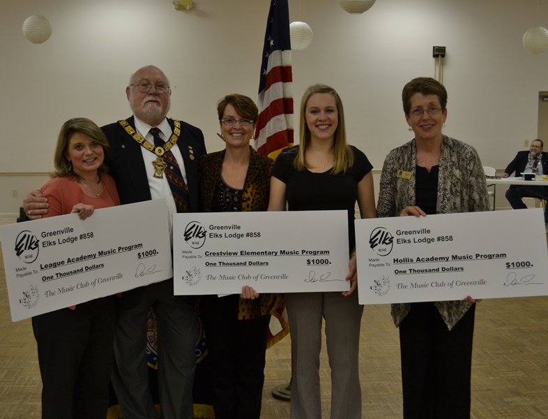 The Greenville Elks Lodge recently donated $1,000 each to three Greenville County Schools through the Music Club of Greenville. The donations to the music teachers from Crestview Elementary, Hollis Elementary and League Academy are specifically designed to purchase new and improved music instruments for students.