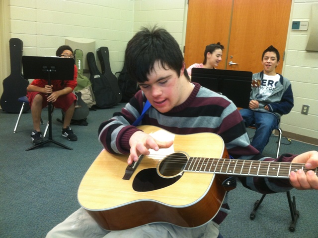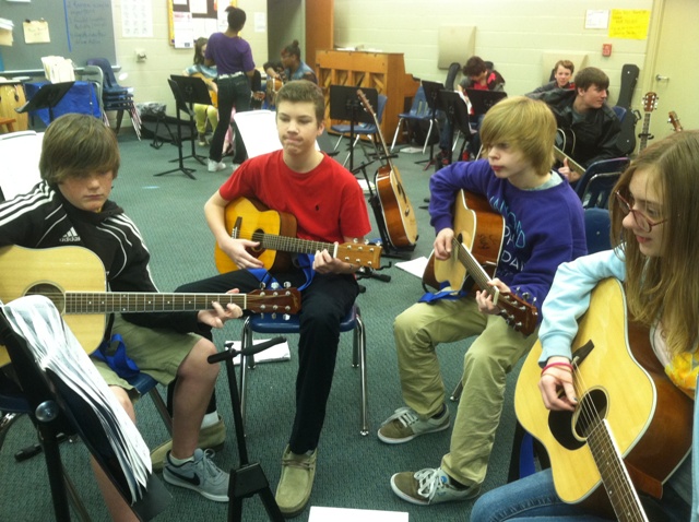 Riverside Middle School ushered in Music in Our Schools Month during the morning announcements last Friday with the National Anthem played by a guitar quartet--Eric Kane, Fulton Garner, James Bright, and Dylan Faulk . Other "Mighty Royal" activities celebrating Music in Our Schools Month include a daily trivia contest, a school-wide display encouraging all students to write about how music has affect their lives, and the annual non-auditioned Entertainment Cafe presentations "open mic" for instrumentalists, singers and dancers during the grade level lunch shifts. The Entertainment Cafe schedule is as follows: Grade 6 Friday, March 8, Grade 7 Friday, March 15, and Grade 8 Thursday, March 21. On Friday, March 29, faculty and staff will perform during their lunch shift for students.