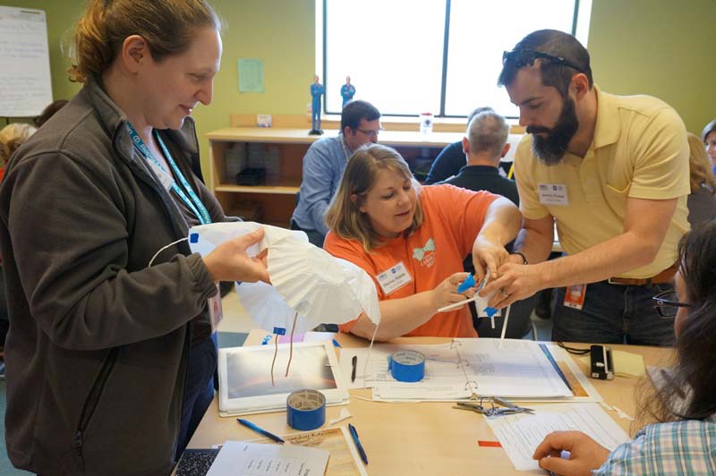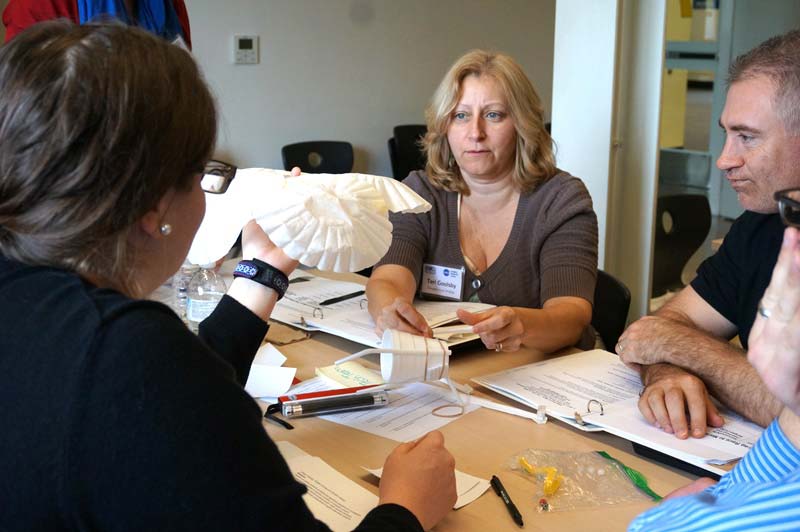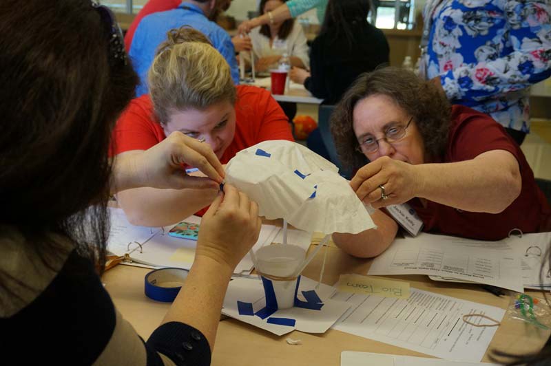 One unit involved how built and land the rover on Mars. Teachers watched Seven Minutes of Terror, a NASA video explaining the technical aspects of how the module travels from the top of the atmosphere down to the surface of Mars without crashing. The next step was for the teachers to use common household supplies like a Styrofoam cup, rubber bands, coffee filters, and duct tape, to build and tested their own modules.