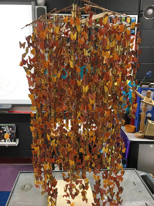 This community arts integration project was developed and directed by Elaine Quave, SCGSAH visual arts faculty member. Quave visited participating schools throughout the state to work directly with the students. "In these one-hour sessions, I covered science standards, teaching them about Monarch ecology and their endangered migration patterns, while also reviewing design principles such as pattern, rhythm, and symmetry as they paint their butterfly wings," explained Quave.