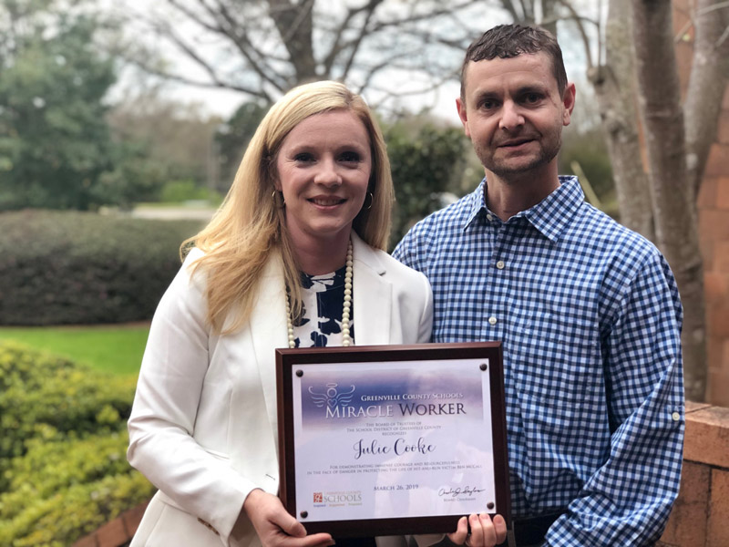 Unbeknownst to Julie, the cyclist whom she so selflessly assisted and protected is also a Greenville County Schools employee, Ben McCall of our Education Technology Services. Principal Cooke stayed with Ben and prayed for him until the police and paramedics arrived, and then continued to assist by providing valuable information concerning the accident and a description of the hit-and-run driver.