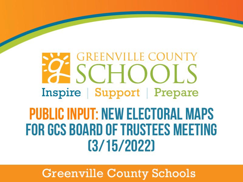 As part of the redistricting process and as a result of the 2020 Census data, the proposed electoral maps will be reviewed and voted on by the GCS Board of Trustees at the Board meeting on Tuesday, March 15, 2022. The possible versions of the maps received by the State Fiscal and Revenue Affairs Office can be found at the Board of Trustees website. The School District encourages the public to review the versions and to provide comments during the public comment period at the Board meeting. The procedures for registering and speaking at the Board meeting can be found at the GCS Board page.