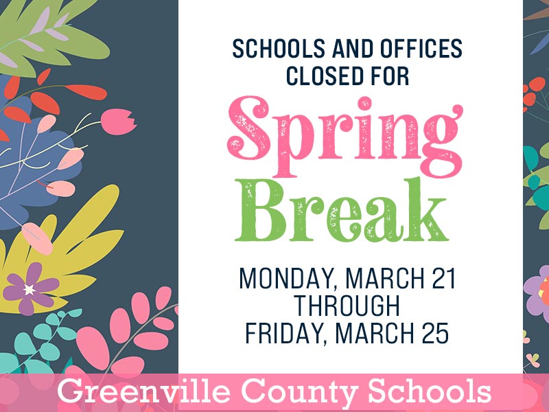 Greenville County schools and offices will be closed March 21-25 for Spring Break. Please note that Friday, March 18, is a teacher workday and students do not attend school.