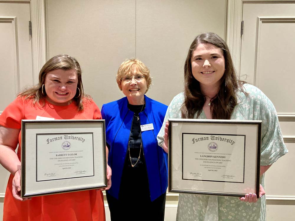The award for first-year teachers was established in 2009 by Marybeth Bunting Childers, an education major at Furman who founded two schools and was named North Carolina Teacher of the Year, and her husband, Alfred Childers, a former member of Furman’s Board of Trustees.