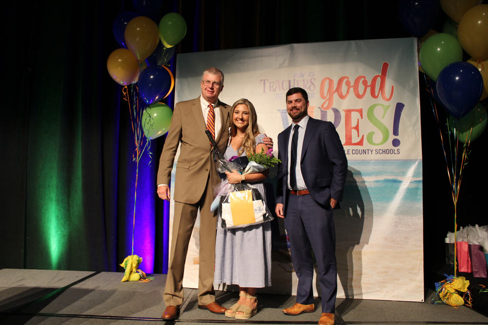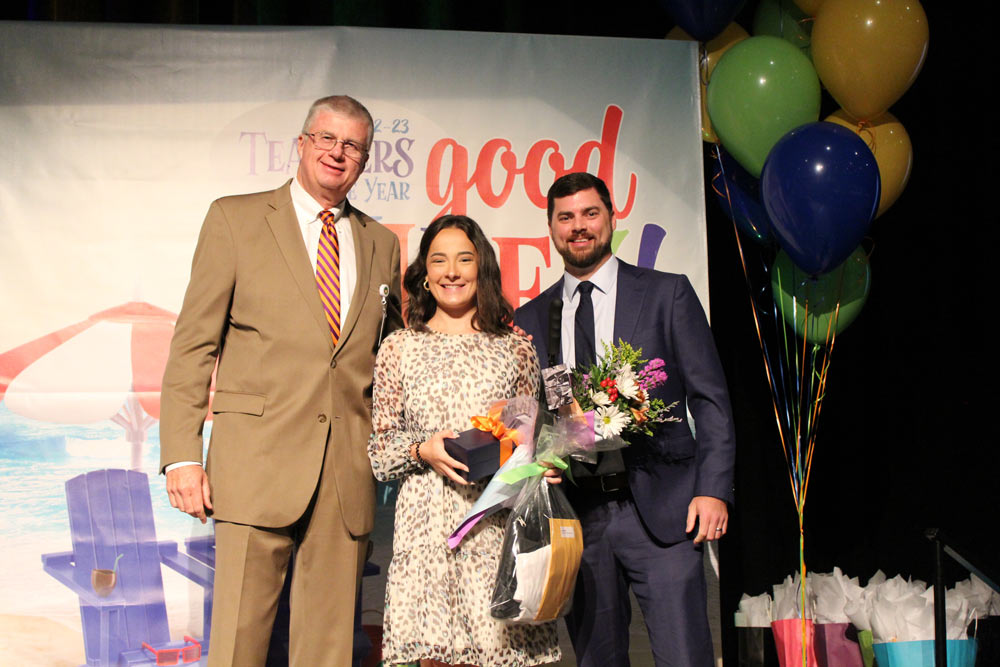 Two outstanding second- or third-year teachers have been recognized as 2022-23 Emerging Teachers of the Year. They are Cait Frederiksen McManaway, third grade teacher at Fork Shoals School, and Katherine West, English Language Arts teacher at Greenville Middle Academy. They were presented with awards and prizes by Superintendent Dr. Burke Royster during a special Teacher of the Year breakfast.
