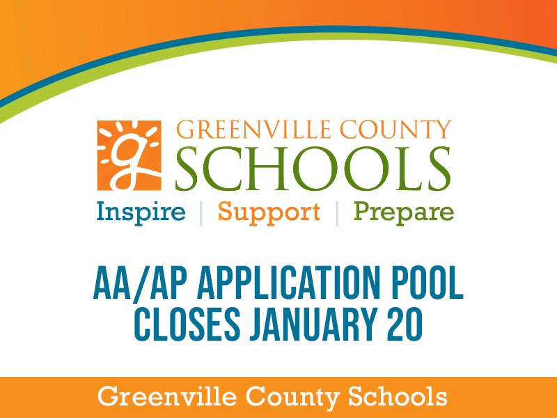 Applications for the Greenville County Schools Administrative Assistant and Assistant Principal (AA/AP) Pool open December 5 and will close January 20, 2023. Any person with the required certification for Elementary or Secondary Principal or who will possess such certification before the 2023-2024 school year is encouraged to apply. All apply to Job ID# 14724 in the GCS online applicant system.