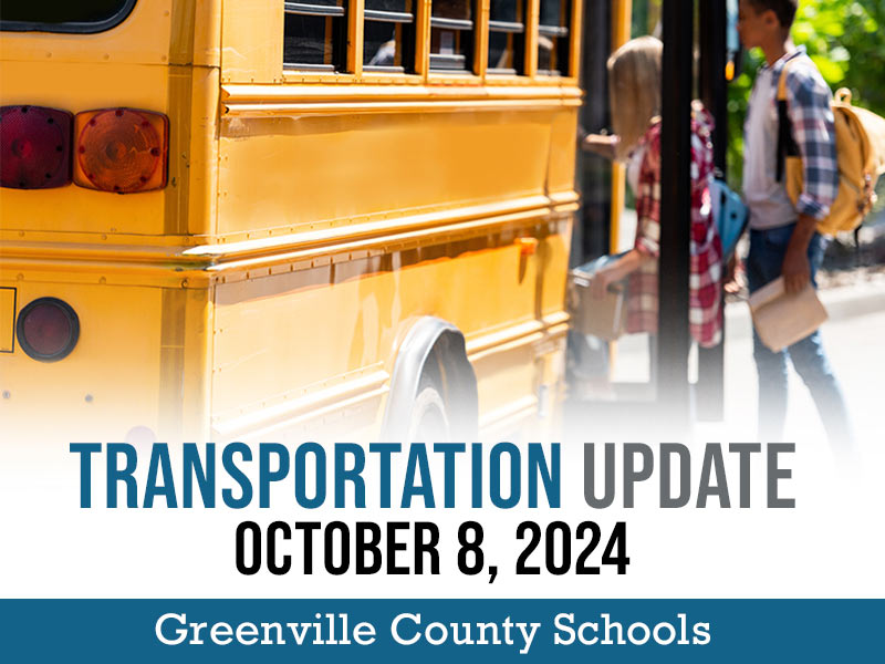 Reminder: Greenville County Schools will operate on a regular schedule on Wednesday, October 9. However, some bus routes will be adjusted to avoid problematic areas, which may result in minor delays. Parents of students on affected routes will receive direct phone notifications with any updates. Overall, road conditions across the district have shown improvement, and we look forward to welcoming students!