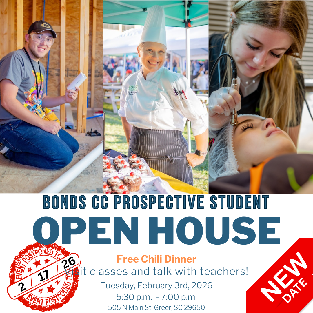 All future students and their families who are interested in applying for a program are invited to attend an open house at Bonds Career Center on February 17th from 5:30-7:00 p.m. Families will be able to tour each program, talk with instructors and administration, and have a free chili dinner prepared by our Culinary Arts students and instructors.