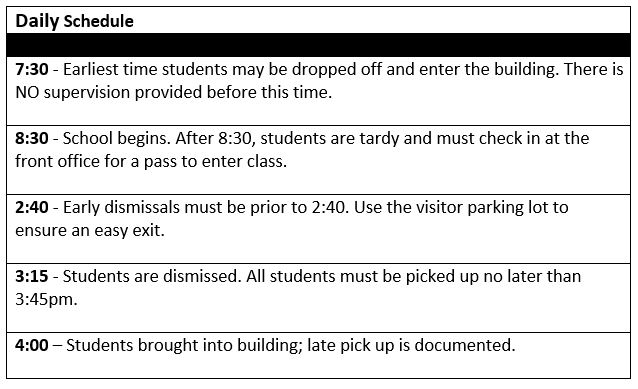 - 3:15 - Students are dismissed. All students must be picked up no later than 3:45 pm.